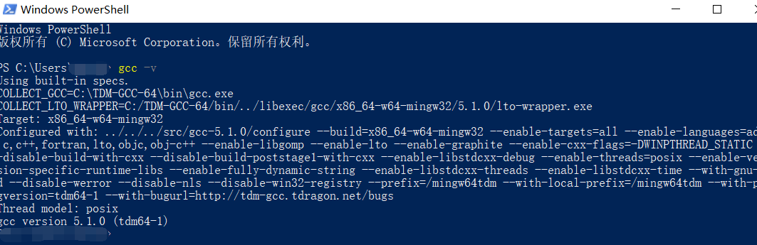安装完成后,在开始按钮右键打开Windows power shell,输入gcc -v 如果出现以下类似的信息,说明安装成功,如果提示没有找到命令,说明没有安装好